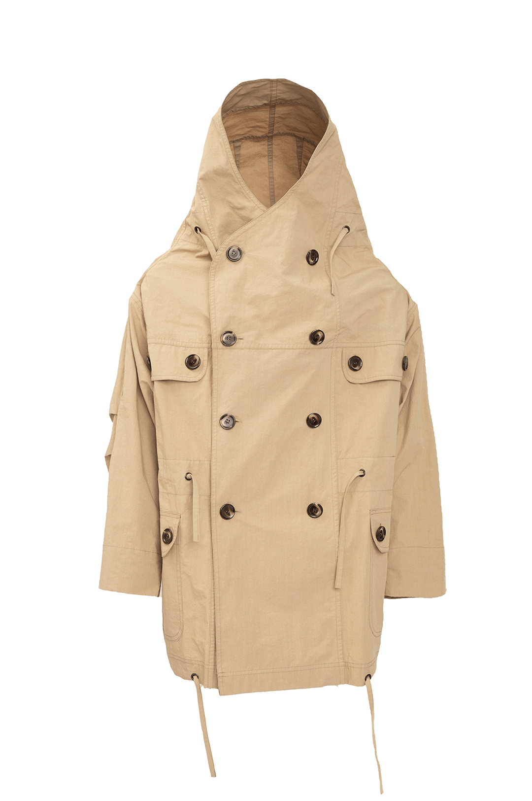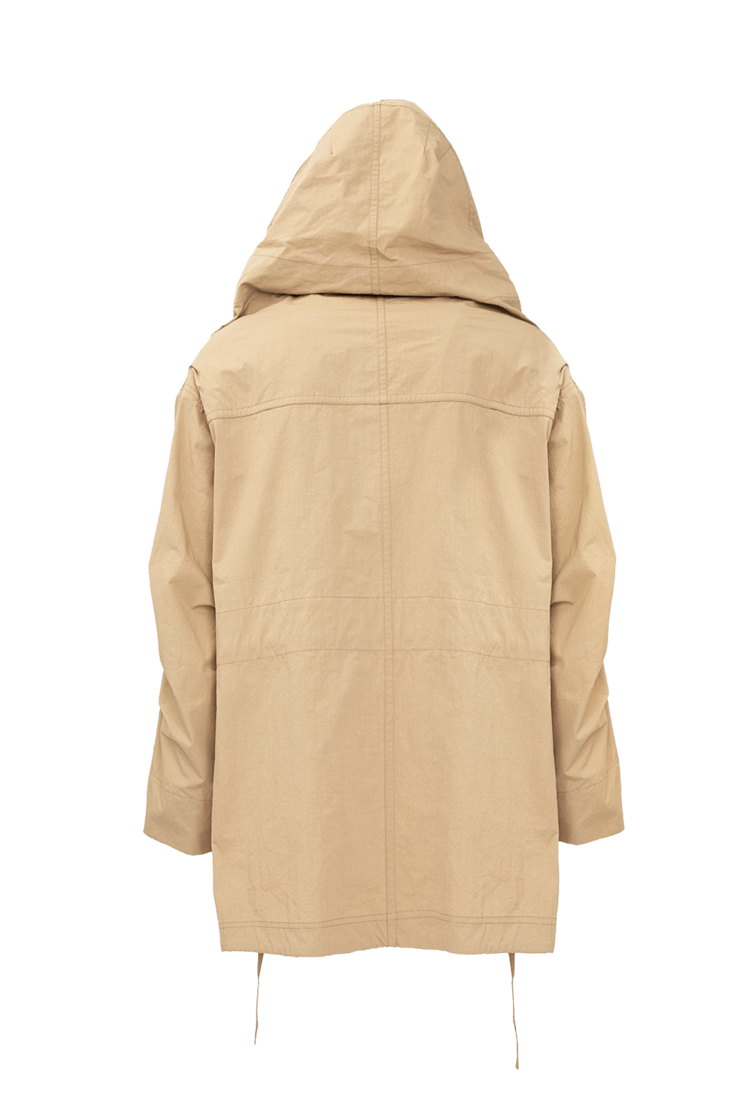A military-looking short jacket with a cocoon hood made of Japanese high-quality typewriter vintage-wash fabric.